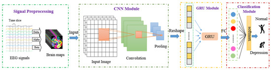 Many previous studies demonstrate that deep learning and EEG can be used to recognize depression [46,47]. In order to prevent mild depression from worsening into moderate or major depression, we should pay more attention to mild depression and detect early symptoms of depression. As we know, EEG signals communicate spatial information, but this information has rarely been considered. Figure 1 illustrates the overview of the proposed framework for predicting depression. As shown in Figure 1, the proposed method contains EEG signal preprocessing, CNN, GRU and classification steps. In the first step, the spatial and frequency information of EEG signals was extracted to generate brain map sequences. Next, the CNN module was used to extract the feature automatically, and then the GRU module was connected to learn sequential information. The network structure and parameters of the strategy in this paper are shown in Figure 2. Finally, the classification module was trained and validated with the features that were extracted in the previous steps and contained spatial, frequency and temporal information.