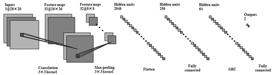 The CNN model can automatically extract features, but it cannot feedback the output to the network and the model has poor performance when learning time-series information. EEG-signal classification is a typical sequence model task. As shown in Figure 2 (GRU module), we proposed a hybrid model that uses CNN and GRU at the same time. The GRU architecture was proposed by Cho et al. [50] in 2014 and is simpler and requires less time than LSTM. The specific implementation of this model is shown in Figure 5, which has specific hidden units called memory cells that are used to remember the previous input for a long period of time.