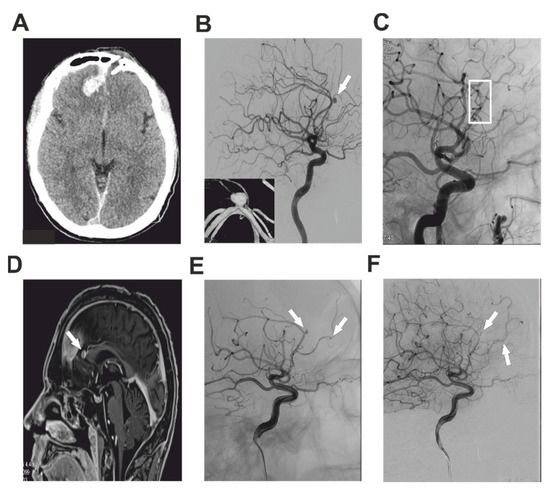 - Asari, S.; Nakamura, S.; Yamada, O.; Beck, H.; Sugatani, H. Traumatic aneurysm of peripheral cerebral arteries. Report of two cases. J. Neurosurg. 1977, 46, 795–803. [Google Scholar] [CrossRef] [PubMed] [Green Version]