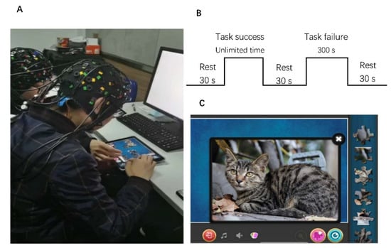 The experiment was carried out in a silent room. The two participants in the dyad sat side by side in front of a shared iPad (Figure 1A). The iPad, which has a 10.5-inch screen, remained at the same brightness throughout the experiment. The task used a free puzzle application named Jigsaw Puzzle (developed by Guihang Xu) that was already open on the iPad. After collecting their demographic data, the experimental task was explained in detail to each dyad. The procedure consisted of one task that could be successfully completed (time unlimited) and one task that could not be successfully completed (5 min) [], with rest times of 30 s before starting the procedure, between tasks, and after finishing the procedure (Figure 1B). For each condition (task success and task failure), the dyad was asked to solve one jigsaw puzzle problem together under different time requirements. Specifically, the goal image of the jigsaw puzzle was a cat (Figure 1C), which was comprised of 35 pieces in the task success condition and 140 pieces in the task failure condition. All pieces were presented on the right side of the screen and could be freely dragged by touch. During the task, the two participants were instructed to take turns placing one piece. They were told that they could discuss the strategy with each other and agree on a specific step. The allotted time was evaluated by all participants with a similar image before the experiment in order to validate the solving time allocation. All participants failed to solve the task failure condition puzzle in 5 min.