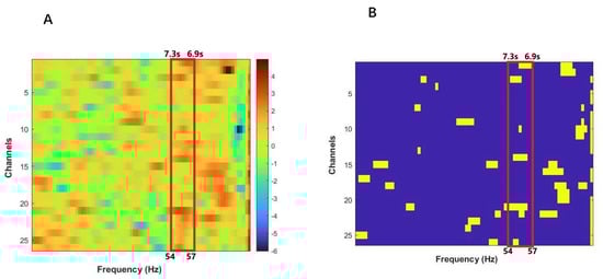 (A) T-value map resulting from a series of paired-sample t-tests conducted on task-related WTC which was defined as increased coherence in the difference between the task success and task failure. (B) Channels with p < 0.05 are marked by yellow blocks. The red border covers the frequency band ranging from 54 to 57.