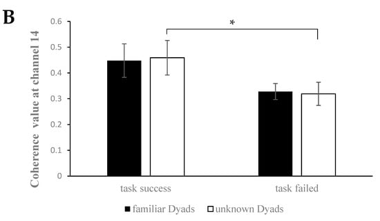 (A) T-maps of the cortical activation difference between the task success and task failure conditions. (B). The amplitude of coherence in the FPC (channel 14) for task condition and dyad composition. *, p ≤ 0.05. Error bars indicate the standard error of the mean. The Y-axis represents the coherence value at channel 14.