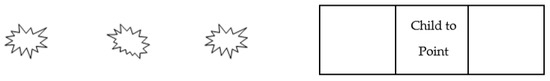 This training task (adapted from Odd One Out Span [54]) focused on the child’s visuospatial EWM and was based on the Odd One Out task. A different set of odd-one-out stimuli to the outcome assessment materials was used to eliminate practice effects and overlap. The task was presented with paper-based materials, rather than on a tablet computer, but otherwise had the same format as the Odd One Out task. Odd-one-out stimuli were each presented as black-and-white line drawings on 10 cm × 30 cm white cards. The response card depicted one or more blank horizontal grids, each containing three empty boxes. The child was asked to remember the spatial location of the ‘odd one out’ items by pointing to the correct position/s on the grid (see Figure 1 for examples).