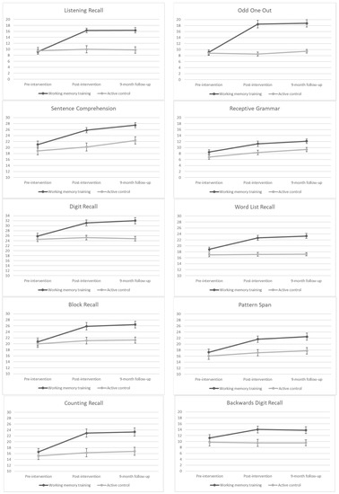 Graphs illustrating raw scores on all outcome measures (with standard error bars) at pre-intervention, post-intervention and 9-month follow-up for both groups (working-memory training and active control).