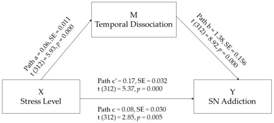 When considering existing evidence on the relationship between stress and dissociative processes, if the individual perceives a high level of stress, dissociation may work as a coping strategy to mitigate this perception. This idea is supported by findings investigating different kinds of stressful experiences (e.g., early life stress [] and daily stress []). On the other hand, in agreement with earlier literature on addiction (e.g., [,]), an increasing amount of evidence suggests that, the higher the stress level, the higher the susceptibility to addiction. Moreover, as time spent is a key marker to predict internet/social network addiction (e.g., []), and as higher temporal dissociation may be conducive to underestimating the amount of time spent online, we expect that this may result in the temporal dissociation level positively predicting addiction level.