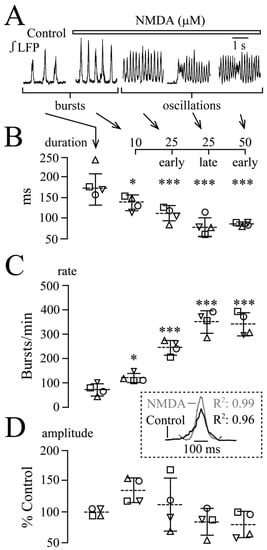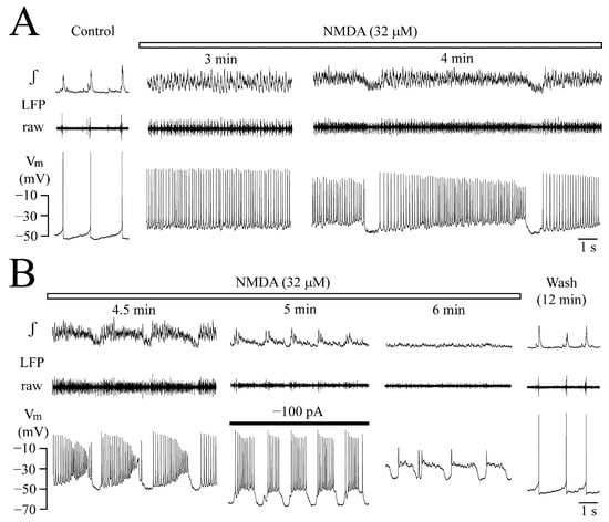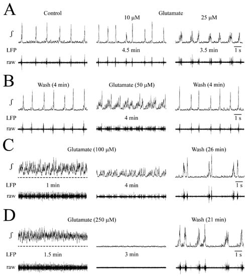 The above findings indicate that the LFP envelope is bell-shaped due to a normal distribution of the occurrence of single spikes that jitter similarly around the LFP peak. Next, dose–response relationships were studied for the effects of NMDA and glutamate to determine the thresholds for putative LFP pattern transformation and elucidate whether high concentrations of the agents perturb network rhythm or cellular spiking as previously reported [].