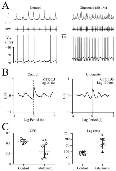Glutamate-evoked attenuated synchrony: Cross-correlation analysis of glutamate effects was done in six slices. In three cases, 25 μM transformed the LFP pattern within 2–3 min. In the other three cases, the glutamate dose was increased after 5 min, from 25 μM to 50 μM, which transformed the pattern after a further 2–3 min. An example for the latter approach is shown in Figure 6A. LFP pattern transformation by 50 μM glutamate was accompanied by a 7 mV depolarization of whole-cell-recorded Vm from its ‘resting’ value of −45 mV. This depolarization accelerated spontaneous discharge in this neuron from 48 to 228 spikes/min. The correlogram for the recording in Figure 6A showed a shallower peak in glutamate vs. control, indicating decreased synchrony, and, correspondingly, the CFE value decreased from 0.5 to 0.35, whereas time lag increased from 90 to 150 ms (Figure 6B). The scatter plots for five neurons show that the effects were significant (Figure 6C). Further spiking in one apparently similar responding neuron did not cross-correlate with LFP and thus could not be analyzed. For the six neurons, mean values were −47.3 ± 2.9 mV for resting Vm, 5.0 ± 1.1 mV (p < 0.001) for the glutamate depolarization and 52.1 ± 4.6 vs. 194 ± 61.0 spikes/min (p < 0.001) (i.e., a 3.7-fold acceleration) for control vs. glutamate.