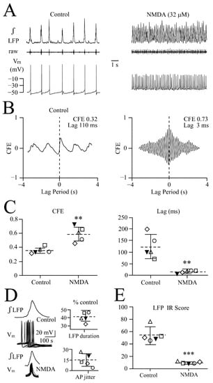 In line with the assumption based on these findings that network synchrony was enhanced, the jitter of the time point of spiking in these neurons related to the LFP decreased from 103.8 ± 34.4 ms in control to 13.9 ± 2.25 ms in NMDA (i.e., to 15.2 ± 7.2% of control) (Figure 7D).