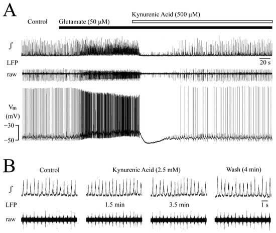 The late countering kynurenic acid effect shows that glutamate effects are mediated by iGluR. To exclude a novel type of inhibitory effect of kynurenic acid in the initial phase of application, 2.5 mM of the agent was added to control superfusate in 4 slices with regular LFP pattern. Kynurenic acid had no effect (Figure 10B) as in our previous study [].