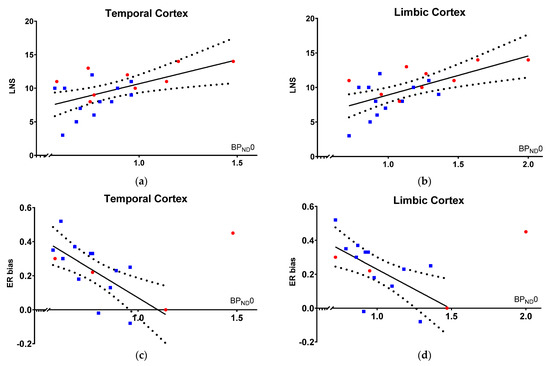 5-HT1BR PET binding vs. cold and hot cognition at baseline. [11C]AZ10419369 BPND0 in PD patients (blue squares) and controls (red circles) versus: (a,b) LNS score in the temporal and limbic cortex; (c,d) ER bias in the temporal and limbic cortex. One control, with ER bias as outlier (>2SD), was excluded from the regression analyses. LNS and ERbias are anticorrelated at a sub-significant level (Spearman correlation coefficient −0.29, p = 0.27).