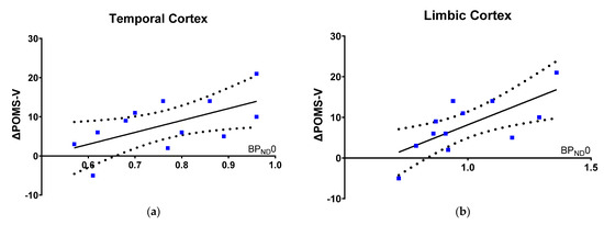 The correlation between [11C]AZ10419369 BPND0 and change in overall mood state (ΔPOMS-TMD) from turning DBS-STN off only reached borderline significance (p = 0.10) in the limbic cortex. We did not observe an association between the ΔPOMS-V and the regional change in BPND between the two conditions, DBS turned on and off.