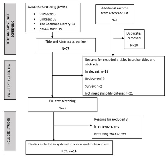 Literature searches were executed in PubMed, the Cochrane Library, and EMBASE, comprising studies published until May 2021. The grouping of keywords used was acceptance and commitment therapy AND (obsessive-compulsive disorder OR OCD OR compulsions OR obsessions). Those search terms were employed in changeable versions to look for supplementary literature on Google Scholar. The 95 results were then assessed for pertinent materials to decrease publication bias. Two reviewers screened the titles and abstracts. Eligibility criteria adhered to the PICOS framework [23].