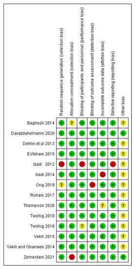 Regarding blinding the outcome estimations, 13 studies (95%) were evaluated as bearing low risks as objective measures rarely gauge the outcomes. As for the incomplete outcome data bias, 12 studies (90%) bear low risks because they conveyed a low rate of dropouts, 1 study was found to have an unclear risk, and 1 study was found to have higher risk. The selective reporting bias was presented as low risk, with 95% of all the studies if all stipulated outcomes were reported. Mostly, every study had an unclear risk of bias under the other bias criterion, and two studies were determined as low risk.