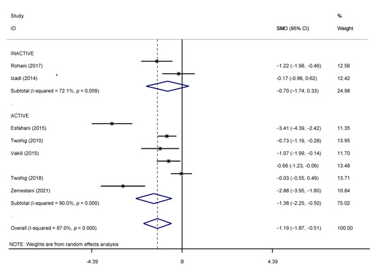 Based on the results above, a subgroup analysis was necessary due to the impediment caused by the active control interventions. Despite a small sample, we noticed the efficacy of ACT in reducing obsessive–compulsive symptoms when paralleled with inactive control groups. The results of the subgroup analyses portrayed various statistically significant effects for active control conditions and non-significant effects for inactive conditions. They are as follows: −1.38 (95% CI, −2.248 to −0.508; p < 0.000) with a 90% I2 for active control and −0.702 (95% CI, −1.735 to −0.332; p < 0.059) with an I2 of 72.1% for the inactive control condition, all explicitly shown in Table 2 and represented by a forest plot in Figure 4.