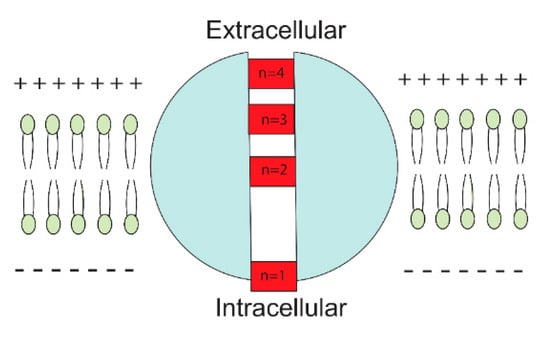 However, the quantum tunneling model can be applied on the closed gates, which include the closed activation and closed inactivation gates. Moreover, the closed inactivation gate can be located at sites other than the intracellular end [,,]. Therefore, to account for the different locations of the closed gate and its influence on the kinetic energy of the extracellular ions, we will assign n values from 1 to 4. See Figure 3.
