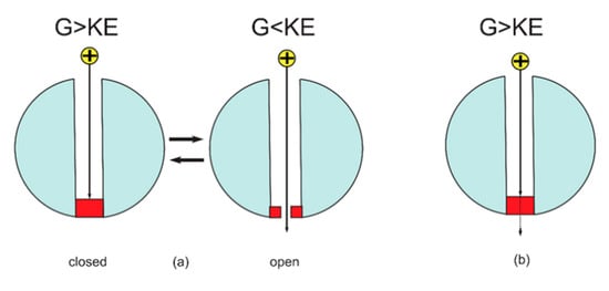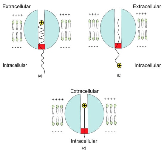 There are extracellular and intracellular ions and they are different in terms of kinetic energy  [,] due the influence of the membrane potential. As the usual location of the closed activation gate is at the intracellular end [,,], then the extracellular ions will go through the membrane potential, which is negative inside with regard to outside, acquiring kinetic energy equal to  until reaching the intracellular closed gate, in addition to the average thermal energy , while intracellular ions will hit the intracellular closed gate having only the average thermal energy . See Figure 2.