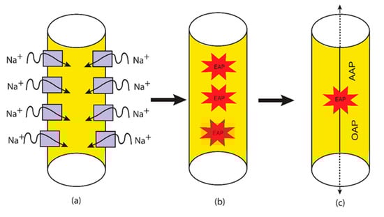 The basic idea behind the formation of a “quantum synapse” between axons is that when an action potential is transmitted through a neuron, there will be a probability that this stimulated neuron will induce an ectopic action potential (EAP) in an adjacent unstimulated neuron. This ectopic action potential induction is achieved via the quantum tunneling of potassium ions through the closed potassium channels, which are exposed upon demyelination after being covered by the myelin sheath [,,,]. This implies that the formation of quantum synapses is enhanced among unmyelinated or demyelinated neurons because more potassium channels are available for quantum tunneling of potassium ions. If an ectopic action potential is induced, then it is expected to detect both orthodromic action potential (OAP) propagation and antidromic action potential (AAP) propagation [,,]. See Figure 5.