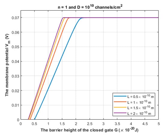 The figure represents the relationship between the membrane potential of neurons and the barrier height of the closed gate under the influence of the quantum tunneling of sodium ions through the closed gate of sodium channels. The relationship is investigated at different values of gate length L and according to the setting values above the figure.