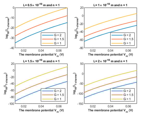Furthermore, the gate length L varies according to the number of hydrophobic residues involved in forming the hydrophobic gate. For example, in [,] there are three hydrophobic residues and each pair is separated by another three residues; hence the whole path is composed of nine residues. From these references [,], it can be estimated that  m. However, voltage-gated channels are sealed off by one hydrophobic residue from each of the four subunits [,,]. Therefore, by a simple comparison, if nine residue-paths yield  m, then it is expected that one residue-path yields  m. However, we included four setting values for the gate length L in our investigation, which are  m,  m,  m, and  m to cover wide range of possible values of L.