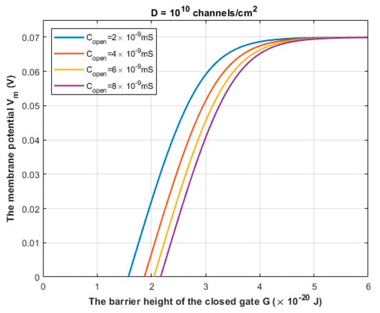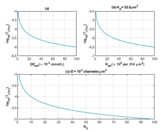 For the sake of simplicity, we will assume that one channel of the total channels in 1 µm2 is enough to depolarize the membrane potential to the threshold value. Therefore,  channels/cm2 (which corresponds to 1 channel/µm2) will be substituted in Equation (15). Accordingly, by substituting the values of concentrations and conductance in Equation (15), the relationship between  and  can be obtained: