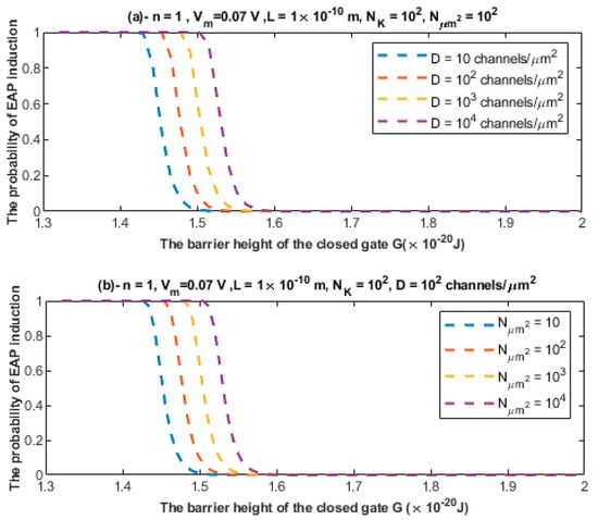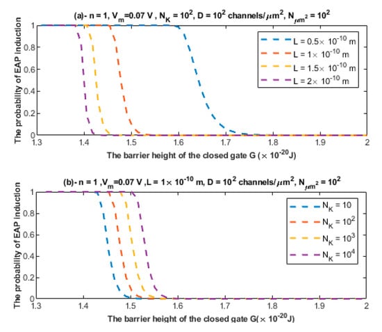 If  mmol/L is substituted into Equation (16), then the threshold value of quantum tunneling . This means that if at least one channel in a surface area of 1 µm2 is required to induce an action potential, then at least a fraction of  from the total potassium ions hitting the channel must tunnel through the closed gate to depolarize the membrane potential sufficiently to induce an ectopic action potential. As was explained before, this change in membrane potential corresponds to around 44 potassium ions, which hit a single closed channel. Then, if at least one potassium ion from the total 44 potassium ions tunnels through the closed gate, then the minimum tunneling fraction will be . If this minimum fraction is compared with , which represents the minimum tunneling fraction required to induce an action potential from at least one channel in 1 µm2, it is clear that the process of tunneling can induce an ectopic action potential since . Therefore, we aim to calculate the probability of reaching this significant fraction of tunneling based on the actual tunneling probability, as shown in Equation (5). Since the action potential is propagated through the neuron, there will be many chances available for potassium ions to tunnel through the closed channels in the membrane of unstimulated unmyelinated/demyelinated neurons. This implies that along the surface area available for potassium ion tunneling, there will be a probability that at least one potassium ion from the total number hitting a channel (e.g., 44 ions here) will succeed to tunnel and trigger an ectopic action potential.