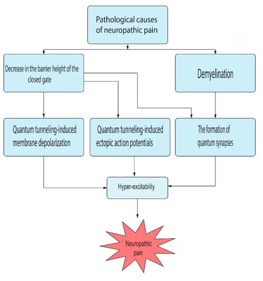 The pathological causes of neuropathic pain can decrease the barrier height of the closed gate of voltage-gated channels and induce demyelination. These two major pathological effects contribute to the emergence of obvious quantum behavior of sodium and potassium ions. Three pathophysiological aspects can be revisited in the context of the quantum tunneling model, which contribute significantly to the pathogenesis of neuropathic pain. The first aspect is the quantum tunneling-induced membrane depolarization which is mediated by the inward quantum tunneling current of sodium ions. The second aspect is the formation of quantum synapses which are formed by the quantum tunneling of potassium ions that exit during action potentials. These quantum synapses explain the ephaptic interactions between injured neurons. The third aspect is the quantum tunneling-induced spontaneous neuronal firing and generation of ectopic action potentials. All these three pathophysiological aspects create a state of hyperexcitability among pain fibers that explains the clinical manifestations in the patients with neuropathic pain. See Figure 17.