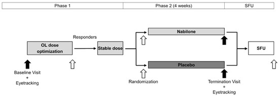 Ellmerer, P.; Peball, M.; Carbone, F.; Ritter, M.; Heim, B.; Marini, K.; Valent, D.; Krismer, F.; Poewe, W.; Djamshidian, A.; et al. Eye Tracking in Patients with Parkinson’s Disease Treated with Nabilone–Results of a Phase II, Placebo-Controlled, Double-Blind, Parallel-Group Pilot Study. Brain Sci. 2022, 12, 661. https://doi.org/10.3390/brainsci12050661