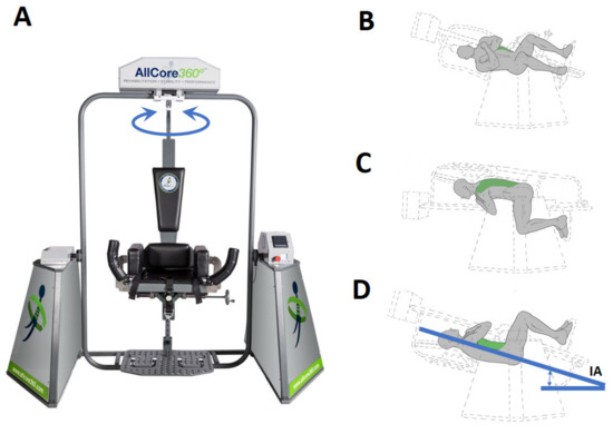 The core-strengthening intervention (CSI) was delivered through the AllCore360° (Figure 1), a commercially available core-training device. The AllCore360° is a device that is specifically designed to facilitate core strengthening through the sustained engagement of trunk muscles during a rotational plank exercise. As shown in Figure 1, the participant sat in the chair which rotated 360° around its central vertical axis. In addition, the outer section of the device enabled the chair to assume a specific posterior inclination angle (IA) from 0–90° while rotating. During a single rotation or ‘spin’, the chair completed a 360° rotation in approximately 80 s, and this angular speed was kept constant for all trials and conditions/IAs. During the spin, participants were asked to hold the body in a plank position without depending on the extremities and without touching their back to the backrest. Figure 1B,C shows the participant positions at different stages of a spin.