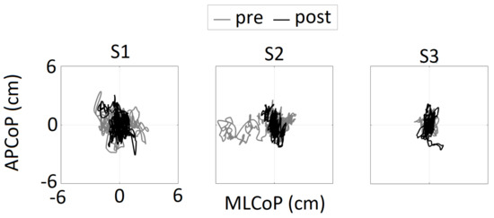 Biomechanical changes were assessed using the QS CoP data from before and after the CSI. As shown in Figure 2, the statokinesiograms (x axis: medial-lateral (ML) CoP, y axis: APCoP) for all three participants showed unstable postural control characterized by large variability and excursions, which were particularly apparent in the ML direction. Post-intervention data showed reduced CoP excursions in the ML direction for all participant, which were quantified in terms of %change and are presented in Table 4. For S1 and S2, the MLCoP range decreased by 29% and 69%, respectively, and the MLCoP RMS decreased by 32% and 72%, respectively.