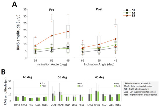 Figure 3A shows the box plot representation of EMG data for each participant. For each participant, EMG data from all channels were combined for each IA. In general, it was observed that the inclination angle of 45° (highest difficulty) elicited higher levels of activations compared to the IA of 65° (lowest difficulty). This relationship between the IA and the levels of elicited muscle contractions was mostly consistent for S1 and S3 at baseline and for all participants at the follow up visit. Figure 3B shows the mean EMG RMS levels for all participants pre and post CSI. It was observed that the neuromuscular responses varied across participants, particularly for RAB muscles. Although several muscle groups showed increased activations (RSES at 65°, RLD at 55°, and LRAB and RSES at 45°), no definite conclusions can be drawn as no maximum volitional contractions (MVC) normalizations were performed.