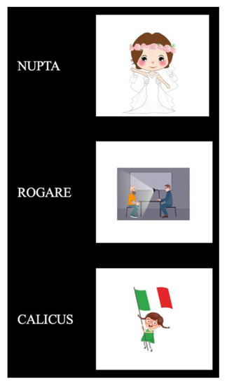 A pre-training phase, consisting of two vocabulary learning phases (VLP) divided by a consolidation period of 2–10 days, familiarized participants with the nouns, adjectives and verbs of Mini-Latin prior to the EEG data collection. This was carried out to allow the participants to consolidate their newly acquired lexical knowledge, as advocated in [33]. The VLP consisted of four training blocks per session. In each block, participants were exposed to all 28 lexical items of Mini-Latin. Each item was presented in its nominative singular form accompanied by a cartoon picture describing it (e.g., a picture of a bride when presenting the word nupta) (see Figure 1). Crucially, neither an Italian nor a German translation was given, in order to avoid any possible language priming effects. Participants were instructed to memorize the item and click a button on the button box when they were ready to move on to the next item. After each block, participants could take a break or directly start with the next one. Every lexical item was presented in capitals (i.e., each letter was capitalized) to avoid possible facilitation and/or priming effects from German (where all nouns are capitalized) (see examples in Table 2). This was not only the case for the VLP, but for the entire Latin experiment (i.e., vocabulary learning phase, grammatical learning phase and grammatical judgment task). Once the four blocks were completed (i.e., participants were exposed four times to each lexical item), participants were tested on their newly acquired vocabulary knowledge. This was assessed via a word-matching task. If they scored above 80% in this task (equivalent to at least 22 correct responses out of 28 total), the training phase was terminated. Otherwise, they were re-exposed to the VLP. Failure to reach the 80% accuracy threshold on a second attempt of the test resulted in the exclusion of the participant from the study. After the consolidation break of 2–10 days, participants returned for the EEG session where they were exposed a second time to the VLP (same process as described above). In total, one participant (2.01%) was excluded from this study during this phase.