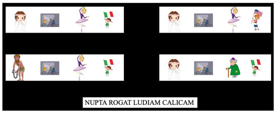 Thus, this phase introduced both nominative and accusative case morphology (critical item ludiam in (8)) and adjective position (calicam). Exposure to case morphology and adjectival position was achieved through the presentation of 128 meaningful sentences in Mini-Latin without explicit teaching/explanations. These sentences resulted from the crossing of the 28 lexical items of Mini-Latin. The sentences appeared together with 4 series of pictures, where each series was composed of 4 figures. Only one series of pictures depicted the correct lexical order of the sentence. The other 3 were composed so that the resulting picture–word pair did not match: once in the subject position, once in the object position and once in the adjective position (see Figure 2). This was carried out to increase the task’s difficulty, to keep the participants motivated and to avoid facilitating the detection of grammar patterns. Participants were instructed to click on the series of pictures they thought depicted the presented sentence. The training session lasted around 45–60 min.