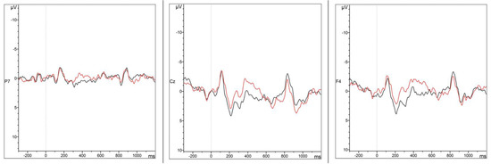 Grand Average ERP waveforms for the grammatical (black) and case morphology (red) conditions in Mini-Latin at electrodes P7, Cz and F4.