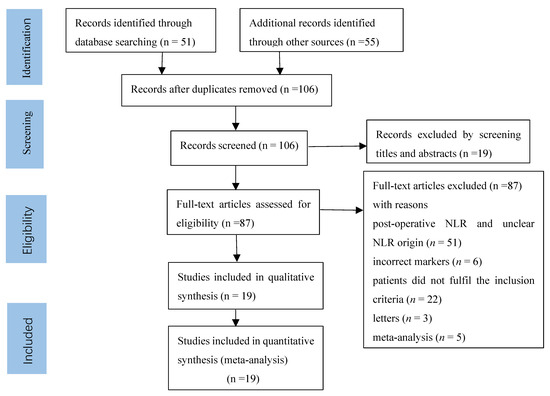 Among the 106 studies obtained based on the search criteria, 87 were excluded for the following reasons: post-operative NLR and unclear NLR origin (n = 51), incorrect markers (n = 6), patients did not fulfil the inclusion criteria (n = 22), letters (n = 3), and meta-analysis (n = 5) (Figure 1). For the final analysis, 19 studies were identified [4,9,19,20,24,25,26,27,28,29,30,31,32,33,34,35,36,37,38], and the main characteristics of the included studies are shown in Table 1. A total of 2762 patients (938 men and 1824 women) were enrolled in 19 studies. The studies were from China (n = 9), Turkey (n = 4), the USA (n = 1), Portugal (n = 1), the Netherlands (n = 1), Israel (n = 1), Italy (n = 1), and France (n = 1). The extent of surgical resection was also assessed, such as gross total resection (GTR) in 789 patients and other resection measures in 1973 patients. Notably, only one study reported 23 patients who underwent a second surgery, and one study reported the pre-treatment NLR. In addition, NLR thresholds varied in the included literature, with 10 studies having a threshold value of 4 and the remaining 9 studies with thresholds of 2.39, 7, 2.7, 4.1, 2.9, 2.42, 5, 7.25, and 3.31. Seven studies had a post-operative treatment regimen of Stupp + chemoradiotherapy + temozolomide, 3 studies had a post-operative treatment regimen of Stupp + chemoradiotherapy, and 9 studies did not report a post-operative treatment regimen. In terms of analytical methods, 5 studies were obtained by univariate analysis, 2 by unknown analytical methods, and 12 by multivariate analyses.