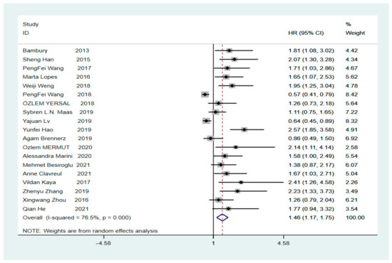 Forest plot illustrating the relationship between the NLR and OS in glioblastoma patients [4,9,19,20,22,23,24,25,26,27,28,29,30,31,32,33,34,35,36].