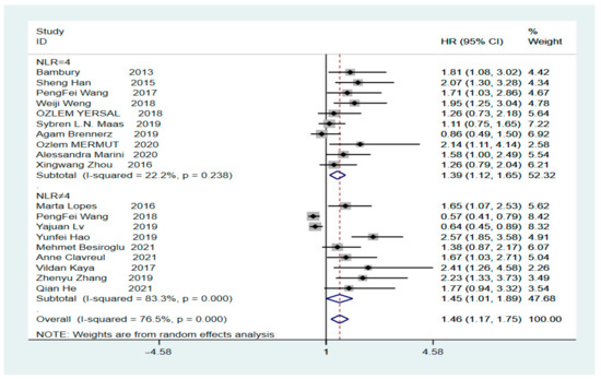 Although previous meta-analyses have shown a correlation between high NLR values and poor OS in patients with GBM, the result was based on sub-group analysis that included not only a small body of literature but also different sources of the NLR. Furthermore, the meta-analysis by Wang et al. [15,16,17] included the study by Mason et al. [46]. The application of hormone therapy, radiotherapy, and chemotherapy can affect NLR values [47]. Additionally, in the meta-analysis of Wang et al. [16], the included studies by Weng et al. [25] and Lei et al. [15] contained data inclusion errors, suggesting publication bias. However, the quantitative results were not assessed using tests, such as Egger’s test. We believe that these issues ultimately affect the credibility of the results. Therefore, we expanded our sample size to avoid these problems and investigated the correlation between high pre-treatment NLR values and poor OS in patients with GBM. Using pre-treatment NLR values as the study index and excluding NLR literature obtained during the application of hormone therapy or radiotherapy, we showed that high pre-treatment NLR values suggested poor prognosis in patients with GBM (HR = 1.46; 95% CI: 1.17–1.75, p = 0.000, I2 = 76.5%). Owing to the presence of high heterogeneity, we performed sub-group analysis of an NLR with different cut-off values and found significantly lower heterogeneity in sub-group analysis of the NLR with a cut-off value of 4 (I2 = 22.2%) and without a cut-off value of 4 (I2 = 83.3%). However, sensitivity analysis failed to clarify the source of high heterogeneity. This result is consistent with the findings reported by Bambury et al. [4,5], who demonstrated that an NLR > 4 is an independent indicator of poor prognosis in patients with GBM.