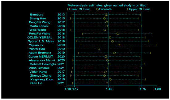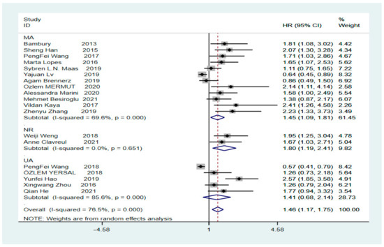 To further identify sources of heterogeneity, sensitivity analysis was performed, revealing that single-factor studies were not associated with high heterogeneity (Figure 4). Sub-group analysis was again performed for univariate, multivariate, and unknown sources, which showed HRs of 1.41 (95% CI: 0.68–2.14, p = 0.000, I2 = 86.5%), 1.45 (95% CI: 1.09–1.81, p = 0.000, I2 = 69.6%), and 1.80 (95% CI: 1.19–2.41, p = 0.000, I2 = 0.0%), respectively. Sub-group analysis indicated that the heterogeneity in both univariate and multivariate sources was not significantly reduced (Figure 5). Finally, we performed meta-regression analysis to evaluate whether country, year of publication, age, sex, extent of surgical resection, and treatment method affected the heterogeneity. The results revealed a heterogeneity of Tau-squared = 0 after inclusion of these six variables, which was 0.2504, less than the previous value of 0.2504 (Figure 2). These data imply that country, year of publication, age, sex, extent of surgical resection, and treatment method can be used to explain 76.5% heterogeneity among studies (Table 3).