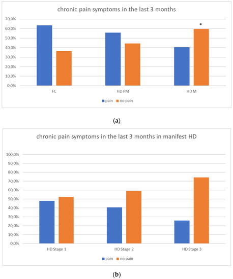 - Sprenger, G.P.; Roos, R.A.C.; van Zwet, E.; Reijntjes, R.H.; Achterberg, W.P.; de Bot, S.T. The prevalence of pain in Huntington’s disease in a large worldwide cohort. Parkinsonism Relat. Disord. 2021, 89, 73–78. [Google Scholar] [CrossRef]
