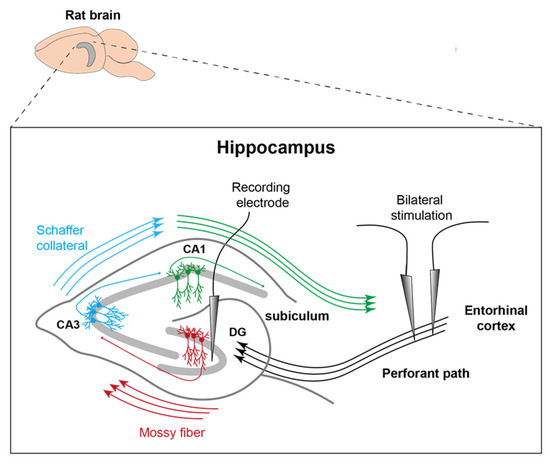 Representation of electrode position. Stimulation electrodes were inserted into the PP on both sides and the recording electrode was placed in the left DG. MD took place more posterior and along the longitudinal axis of the right posterior hippocampus (modified after [15]).