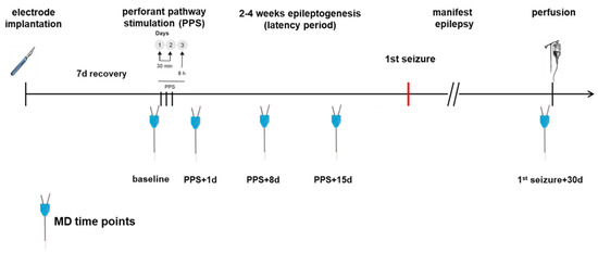 MD in the epilepsy group was performed before the first stimulation (baseline) and additional MDs were performed on days 1, 8 and 15 after PPS being time points during epileptogenesis as well as 30 days after the first spontaneous seizure. The control group had the same MD time points and PPS took place only in the epilepsy group. For an annotated timeline, see Figure 2. Prior to MD, 500 µL of blood was sampled via the tail vein and centrifuged for 10 min at 5000 rpm. The MD probe (high cut-off 100 kDa, CMA 12, CMA Microdialysis AB, Kista, Sweden) was lowered into the hippocampus through the guide cannula. Using an automatic syringe pump, a flow rate of 1 µL of artificial cerebrospinal fluid (aCSF: NaCl 58.44 g/mol, KCl 74.56 g/mol, CaCl2 147.02 g/mol, MgCl2 203.3 g/mol, Glucose 180.16 g/mol, 0.5% BSA in distilled water, pH 7.2 to 7.4, sterile filtered) per minute allowed the collection of 60 µL of sample per hour in the awake animal, which was free to roam, eat and groom in its cage during the entire procedure. The first 60 µL were discarded to allow the establishment of a steady state, as recommended by the manufacturer. In total, 4 × 60 µL samples per dialysis were collected and to each sample, 1 µL of protease inhibitor (Creative Enzymes, Shirley, NY, USA) was added. The obtained serum and MD samples were stored at −80 °C.