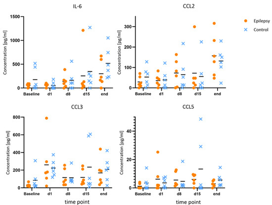 No changes of note for IL-6, CCL2, CCL3 and CCL5 during epileptogenesis. Concentrations of IL-6, CCL2, CCL3 and CCL5 at baseline, during and after epileptogenesis in epileptic animals vs. controls (n = 6 each group) shown as scatterplots of single values with mean values [pg/mL]. No systematic changes were found.