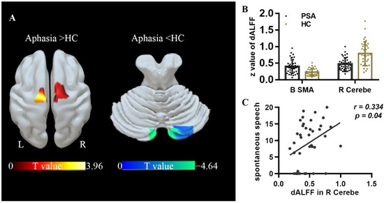 - Zhang, X.; Chen, Z.; Li, N.; Liang, J.; Zou, Y.; Wu, H.; Kang, Z.; Dou, Z.; Qiu, W. Regional Alteration within the Cerebellum and the Reorganization of the Cerebrocerebellar System following Poststroke Aphasia. Neural. Plast. 2022, 2022, 3481423. [Google Scholar] [CrossRef]