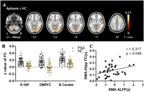 - Yang, M.; Li, J.; Li, Y.; Li, R.; Pang, Y.; Yao, D.; Liao, W.; Chen, H. Altered Intrinsic Regional Activity and Interregional Functional Connectivity in Post-stroke Aphasia. Sci. Rep. 2016, 6, 24803. [Google Scholar] [CrossRef] [Green Version]