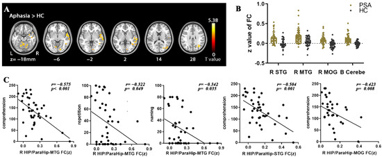 - Li, J.L.; Du, D.R.; Gao, W.; Sun, X.C.; Xie, H.Z.; Zhang, G.; Li, J.; Li, H.L.; Li, K.F. The regional neuronal activity in left posterior middle temporal gyrus is correlated with the severity of chronic aphasia. Neuropsych. Dis. Treat. 2017, 13, 1937–1945. [Google Scholar] [CrossRef] [Green Version]