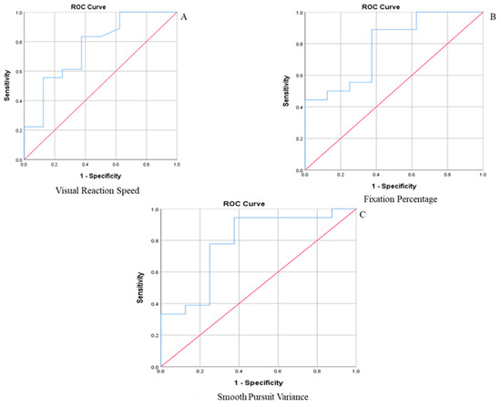 Among the smooth pursuit parameters, the ROC curves were significant for the Visual Reaction Speed, Fixation Percentage, and Smooth Pursuit Variance (see Table 5 and Figure 1). The remaining variables did not produce significant ROC curves and produced low AUC scores.