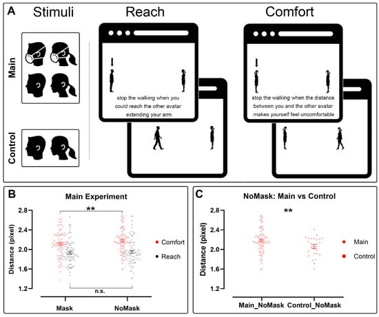 - Iachini, T.; Coello, Y.; Frassinetti, F.; Ruggiero, G. Body Space in Social Interactions: A Comparison of Reaching and Comfort Distance in Immersive Virtual Reality. PLoS ONE 2014, 9, e111511. [Google Scholar] [CrossRef] [Green Version]