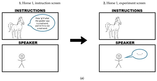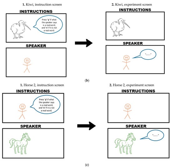 The four conditions were presented as follows in Figure 4a–d (note the black arrow indicates participants clicking ‘next’ to start listening to the stimuli). Participants were in a baseline-speaking, baseline-incidental, priming-speaking or priming-incidental condition. Each block had an initial instruction screen, and then an experiment screen that remained visible during the block. Each screen contained an animal and a stick figure. In the speaking condition, the animal is speaking, and the stick figure delivers instructions. In the incidental condition, the stick figure is speaking, and the animal delivers instructions. The instruction-giver remains present on the screen throughout the block.