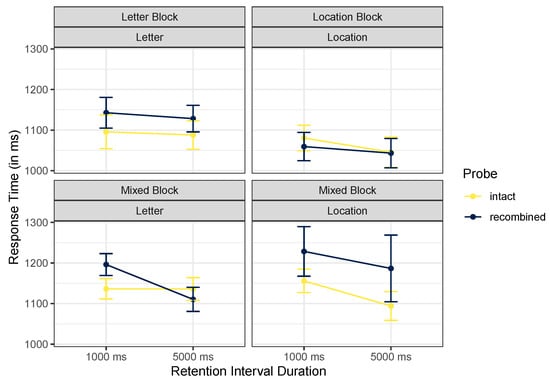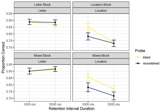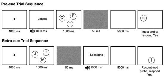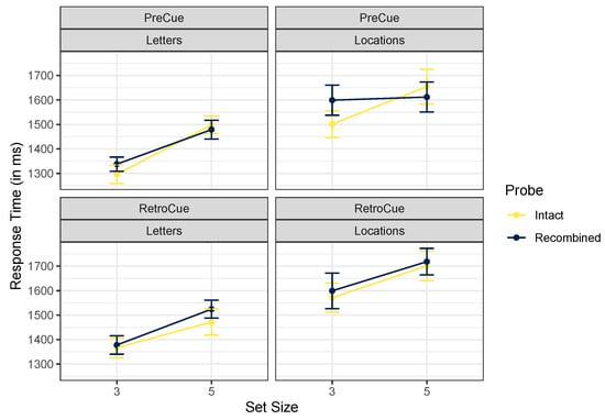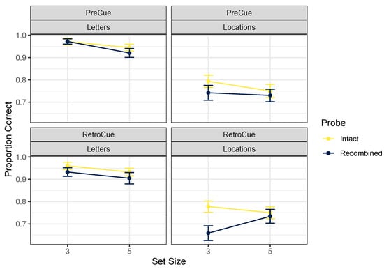 Our data and analysis scripts are available in our Open Science Framework repository (https://osf.io/c9xzh/, accessed on 1 January 2020). Our main analyses of interest were two Cue Timing (pre-cue vs. retro-cue task) by Cue Content (letters vs. locations) by Probe Type (intact vs. recombined probes) by Set Size (3 or 5 items) repeated-measures ANOVAs performed on accuracy and log-transformed response times to accurate probes. While negative probes must be included in the design for internal consistency, following the logic used previously in incidental letter–location binding research [2,3,21,22], incidental binding was determined by considering differences between intact and recombined positive probes. Observing slower or less accurate responses for recombined than intact probes indicates that the irrelevant feature is remembered and considered when making a response: if the irrelevant binding between letter and location is remembered, then intact probes should provoke a higher rate of correct responses than recombined probes, or correct identification of an intact probe should occur more quickly than a recombined probe.