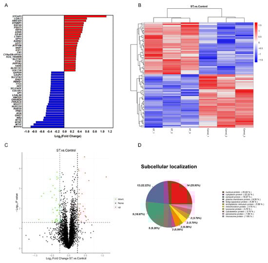 Comparative proteomics analysis of hNSCs in different treatments. (A) The top 25 upregulated and downregulated proteins in the stemazole and control groups, satisfying the criteria of fold change (FC) ≥ 1.2 or ≤0.83 and p value ≤ 0.05. (B) Clustering heatmap of the 77 proteins, in which the expression was altered in different samples. Each row represents one protein, and each column shows one biological replicate. The colour intensity indicates the relative expression level of proteins which by z−value correction. (C) Volcano plot distribution of proteins: 38 upregulated (red dots) and 39 downregulated (green dots) proteins in the stemazole−treated cells compared to the control cells. (D) Subcellular localization of differentially expressed proteins analysed by the Cell−mPLOC 2.0 program.