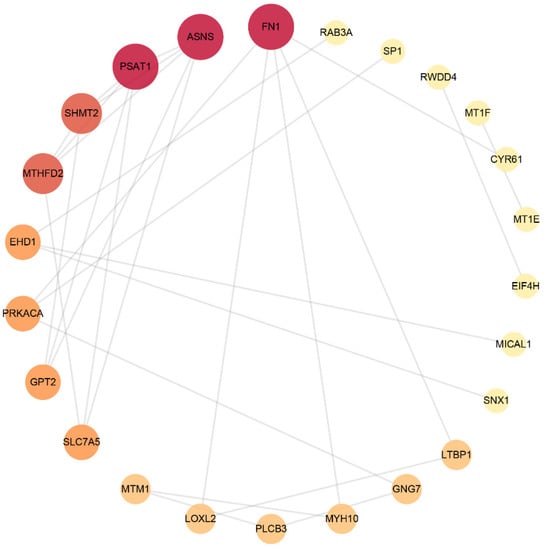 Protein–protein interaction network. The size and colour scales of the circle indicate the node degree centrality. FN1 (fibronectin); PSAT1 (phosphoserine aminotransferase); ASNS (asparagine synthetase); SHMT2 (serine hydroxymethyltransferase); MTHFD2 (bifunctional methylenetetrahydrofolate dehydrogenase/cyclohydrolase, mitochondrial); EHD1 (EH domain-containing protein 1); PRKACA (PKA C-alpha); GPT2 (alanine aminotransferase 2); SLC7A5 (large neutral amino acid transporter small subunit 1); PLCB3 (phospholipase C beta 3).